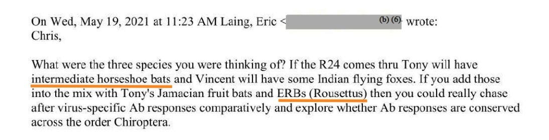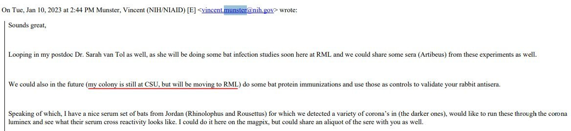 In plain terms: the bats behaved like a classic reservoir host for SARS2. But it was unclear which bats Schountz was testing. The subject line of the April 2020 email says Artibeus or Jamaican fruit bats, but SARS2 does not infect those bats.
