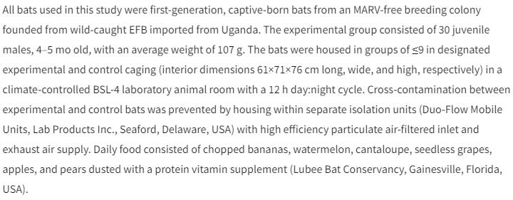 The CDC created a breeding colony to produce disease-free Egyptian fruit bats. These were captive-born, first-generation American lab bats raised in Atlanta, making them easier to handle under BSL4 conditions. Researchers even hand-fed them bananas and watermelons!