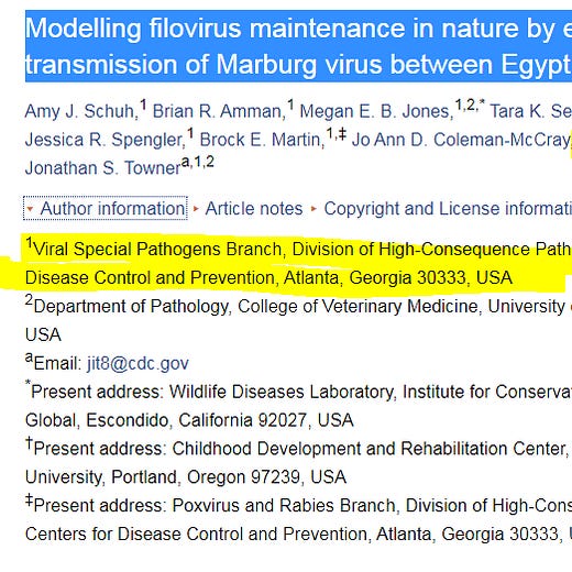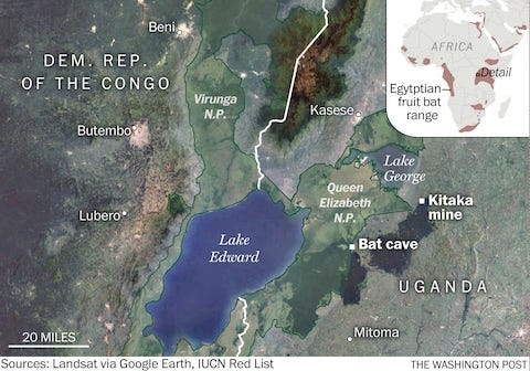 Ironically, Marburg from Africa was named after a German town, where it leaked from a lab. The CDC set up a mobile lab near the Uganda bat caves to collect Egyptian fruit bats and Marburg samples.