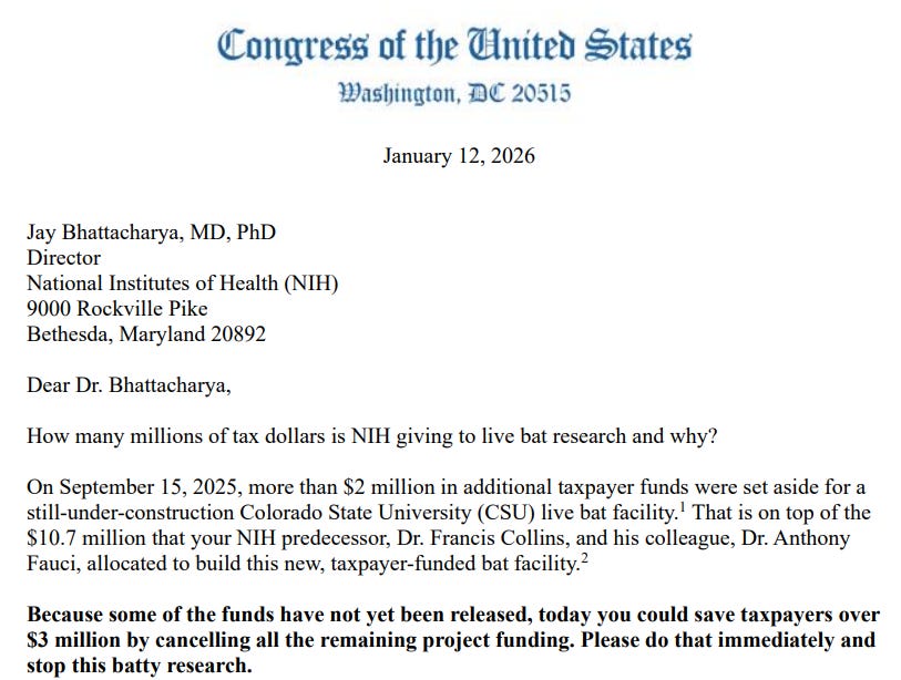 This same CDC bat colony was later referenced in a recent letter to NIH Director Jay Bhattacharya, which called for a pause on a new NIH bat-breeding facility.