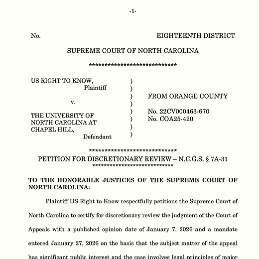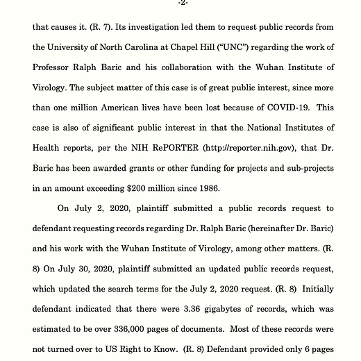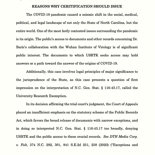 U.S. Right to Know lost its appeal for Ralph Baric’s 2019 UNC records, so it appealed to the North Carolina Supreme Court.