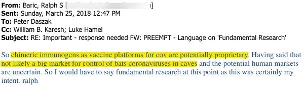 During the drafting of DARPA Defuse, Baric admitted his chimeric immunogens (e.g. HKU3-Smix) are potentially proprietary.
