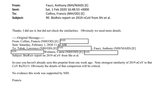 After the Feb 1 teleconference concluded, Francis Collins emailed Fauci about the “strong similarity” of SARS2 to RaTG13.