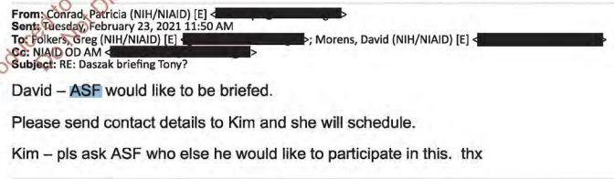 “ASF (Fauci) would like to be briefed” on Daszak’s February 2021 WHO trip to Wuhan. Fauci was upset when this secret Daszak meeting came up in his 2024 testimony. He was also angry when the secret Feb 1, 2020, teleconference was reported in June 2021.