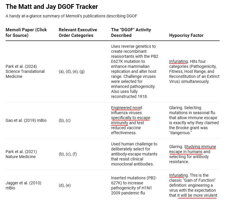 Memoli has created and also intentionally infected human volunteers with these supposedly dangerous and potentially pandemic-causing viruses. He then used these humans to select for seasonal flu viruses that evade host immune responses, including to therapeutic antibodies and vaccines. Being Principal Deputy Director of NIH can certainly give you new, tyrannical means of getting a competitive advantage, since you can tank their grants for allegedly doing DGOF that you do yourself (on humans!!!).