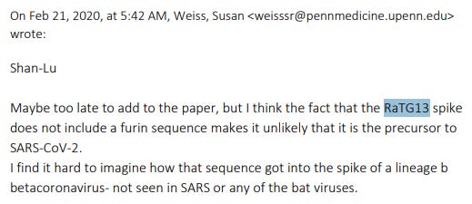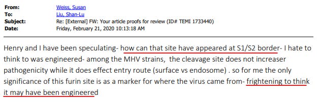 One of the authors of the EMI paper, Susan Weiss, noticed the furin cleavage site (PRRA) and wrote, “frightening to think it may have been engineered.”