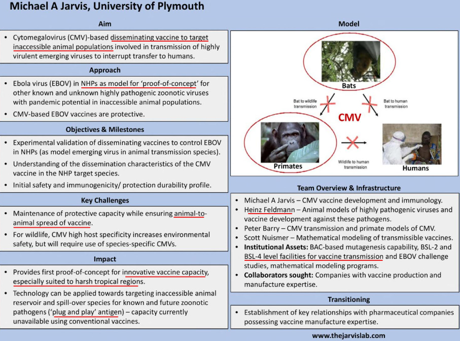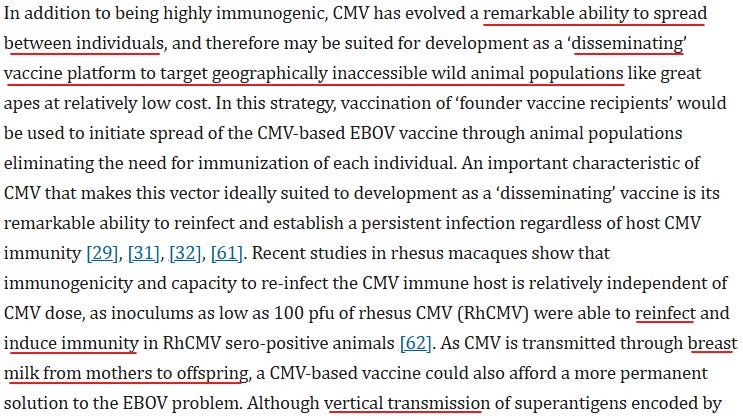 Given its high-species specificity and ability to spread, CMV [herpes virus] may also be suited towards development as a ‘self-disseminating’ vaccine to target wildlife populations involved in EBOV zoonotic transmission (bats and great apes).