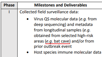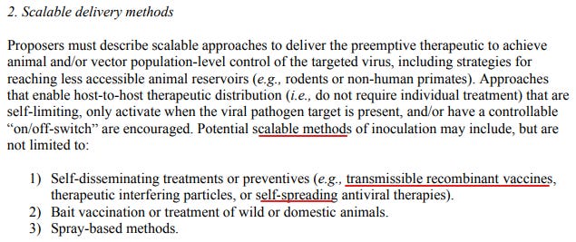 Before the pandemic, his strategy focused on vaccinating wildlife—especially bats, which are a reservoir for pathogens like rabies, Marburg, Ebola, and coronaviruses such as MERS and SARS. From DARPA’s January 2018 request for proposals (BAA):