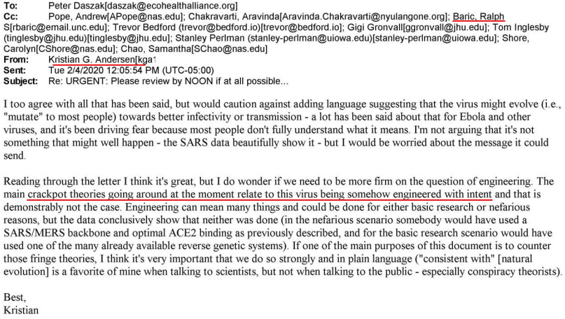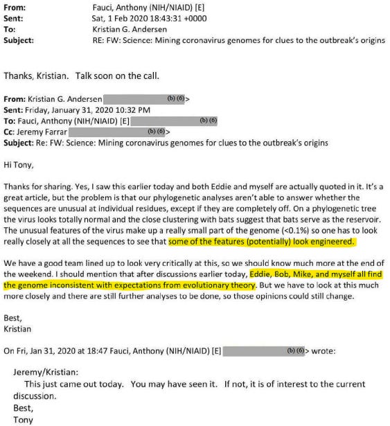 KGA, a world-class evolutionary virologist, then told Fauci via a midnight email that SARS2 “looks engineered.”