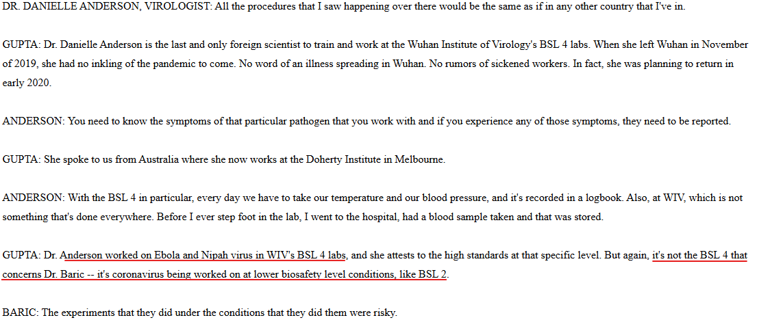 In May 2021, Baric signed their Science paper requesting an investigation into Shi Zhengli’s BSL2 lab. In June 2021, Baric stated that her BSL2 work in Wuhan was dangerous. On September 19, 2021, he appeared on local news alongside Dani Anderson, pointing at her BSL2.