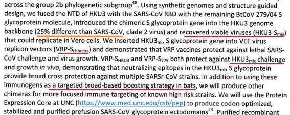 The DEFUSE grant proposal mentions a vaccine technology based on recombinant chimeric live coronavirus vectors, which contain parts of different Sarbecovirus genomes. It also mentions recombinant expression of synthetic genes encoding chimeric spike proteins. These are proteins (not viruses) that consist of parts of the spike protein of a bat coronavirus, SHC014-CoV, parts of another previously known bat coronavirus, HKU3, as well as parts of SARS-CoV-1.