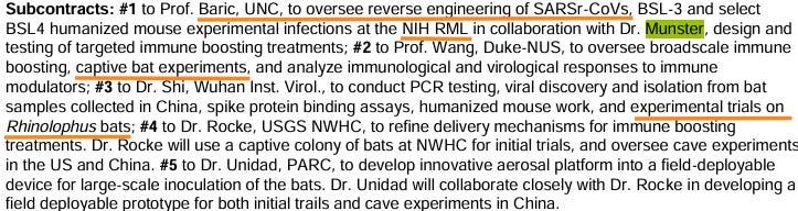 According to DARPA records and Vincent Racaniello, Schountz in Colorado raised Egyptian fruit bats for Munster’s PREEMPT project in Montana. In other words, the exact breeding colony of bats Munster used to aerosolize SARS-CoV-2 in 2019 is referenced in the above 2020 FOIA.