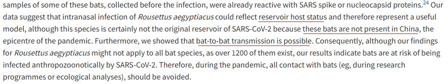 Those same Egyptian fruit bats (Rousettus aegyptiacus) are a reservoir host for SARS-CoV-2, but “these bats are not present in China.”